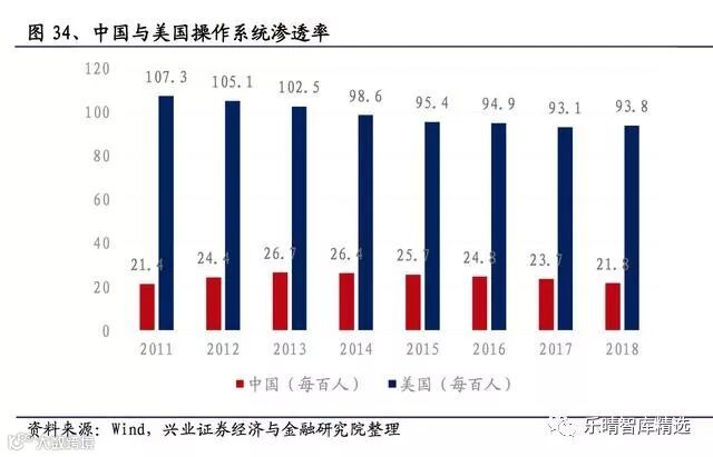 Gartner数据显示,2018年全球企业基础设施软件市场规模2100亿美元左右,其中操作系统部分大约在280亿美元。中国在全球约占10%左右份额,为28亿美元,约189亿元左右。