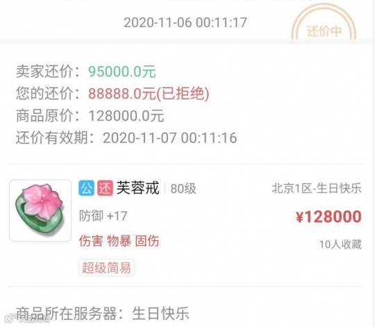 大家看这个超级简易80戒指,主属性防御,下排伤害、物爆和固伤,摆了12.8万。有玩家还价8.8888万调戏一下,没想到对方反还价9.5万。这是调戏不成反被调戏吗?