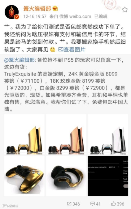 这款已经可以称之为“猎奇产品”的PS5受众人群当然不会是普通玩家,它的纪念意义远远大于实用性。不过有趣的是,国内媒体在为这款土豪特供版PS5宣传时,却因为想试试对方是否真的会包邮而闹了乌龙。