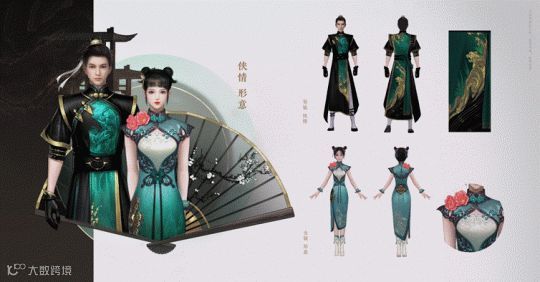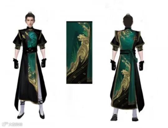 先说这套男版的“侠情”,这套时装以黑、金、绿色为主色调,看上去是不是很自然地就有种庄重、英勇、肃杀的感觉?很神奇吧?