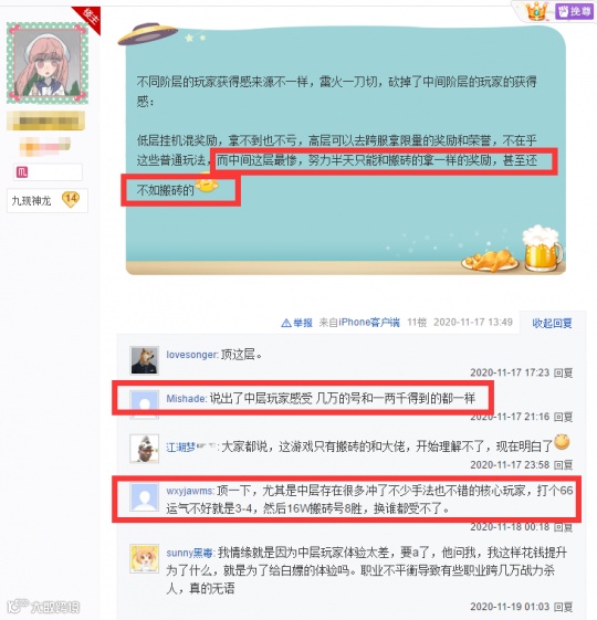 这位玩家进一步指出,低层玩家挂机混奖励,高层玩家跨服拿限量奖励,而中层玩家的获得感极低,打架打不过高战力的,做日常获得只能喝搬砖拿一样的奖励,甚至还不如搬砖的。