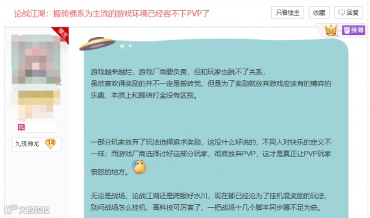 首先是关于PVP玩法体验感大大下降的问题,这位《逆水寒》老玩家发帖控诉:打个战场全是开脚本混奖励的,一点战斗的感觉都没有,直言目前有的区服无论是战场还是论战江湖等PVP玩法,高战力玩家匹配不到对应实力的对手,低战力玩家们打人机打得昏昏欲睡。