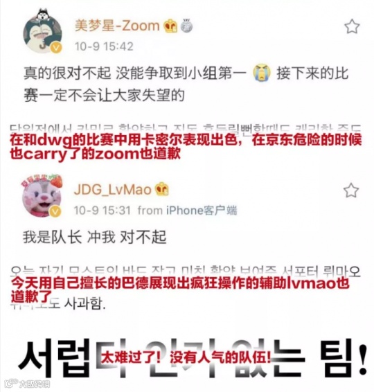 JDG战胜DWG以后却要向粉丝道歉,这一举动让韩国网友们感到一脸懵逼。思前想后最终只得以“JDG人气低”为理由来解释这一现象。