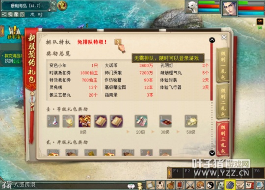 而最高档次的“叱咤三界”礼包中,更是提供了无需排队随时登录游戏的特权,让你随心所欲上上下下,无论干什么都快人一步!大家可以根据自己的情况进行礼包的选择,实用性真的没话说!