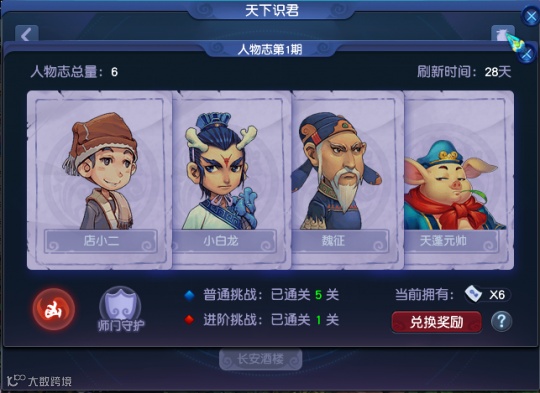 人物志页面可通过天下识君玩法中图标所选位置开启,人物志碎片奖励与碎片数量有关,最低为4张,积累到一定程度后有概率兑换特殊令牌、高级魔兽要诀等物品。