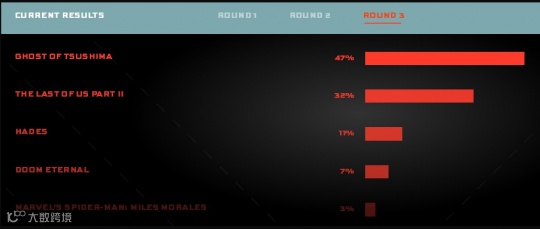《最后的生还者2》(美国末日2)和《对马岛之魂》这两个品质足够好且玩家关注度足够高的游戏,在各大奖项的角逐中都是实力接近的竞争对手。此前TGA 2020玩家之声奖项的五轮投票中,两款游戏交替领先,但最终结果的产生却非常有戏剧性。