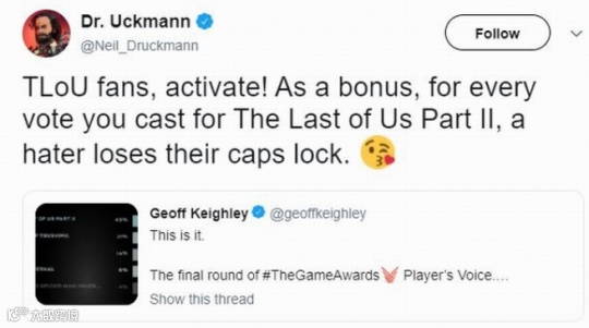 “《最后的生还者2》的粉丝们,行动起来!你投给《最后的生还者2》的每一票,都会让那些反对者们闭嘴。”