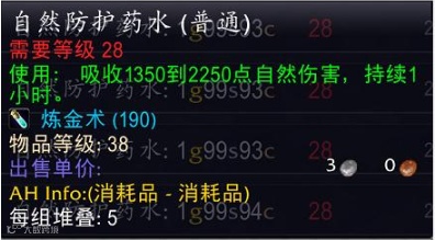 大自然抗性药水是炼金290制品,能吸收1950-3250点自然伤害,小自然抗性药水是炼金190制品,能吸收1350-2250点自然伤害。可以看到,大自然抗的吸收伤害效果比小自然抗高,但也只高出600-1000,而两种药水的价格却相距甚远,以奥罗为例,小自然抗的价格一瓶不到2G,大自然抗一瓶却在15G左右。