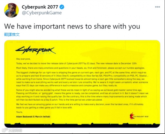就在昨晚,CDPR正式宣布原定于11月19日发售的《赛博朋克2077》将会推迟21天,也就是到12月10日才会上线。这则消息一出全球玩家一片哗然,毕竟这已经是CDPR第三次宣布这款游戏延期发售的消息了。