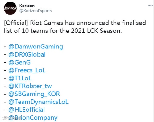 今天上午,韩方公布了2021赛季施行联盟化之后,新的LCK队伍名单。它们分别是:BRB、SB、AF、DWG、KT、DYN、HLE、DRX、GEN、T1。