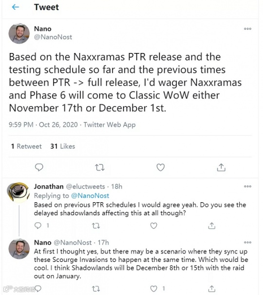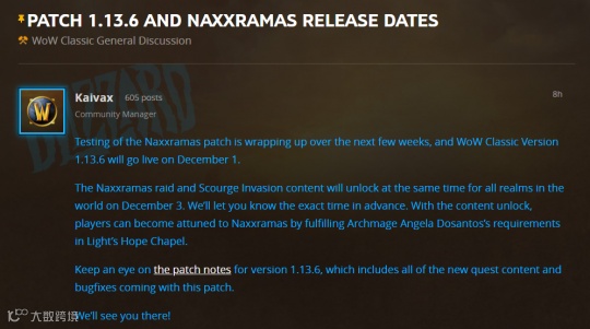 10月31日凌晨,暴雪发布蓝帖,正式公布了怀旧服P6阶段的开放时间:魔兽世界怀旧服1.13.6补丁将于12月1日上线,纳克萨玛斯和天灾入侵内容将于12月3日在世界范围内解锁,不会分阶段。