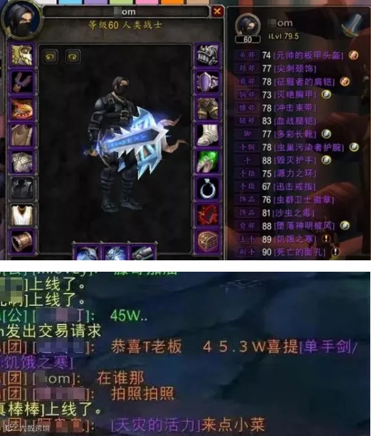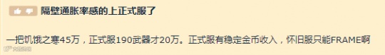 怀旧服最近的金钱大战还传到了隔壁正式服玩家的耳中,45万一把[饥饿之寒]让正式服玩家大吃一惊。最近正式服正处在即将开放团本的时期,在正式服里野怪掉落190的武器卖的贵了也只有20万左右,怀旧服NAXX的价格简直离谱,通胀率已经赶上正式服了。