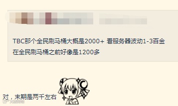但这个比直接买月卡还贵的时光徽章,真的有人会买吗?你还别说,从网络上的反映来看,普通玩家还真负担的起。还有玩家专门计算了一下,一次TAQ能有1000G-2000G,按平均1500G算;一次BWL不出极品平均在300G左右;一次MC平均大概200G;一次ZUG平均200G,就算这四个本的收入,一周打满也能够个2700G-2800G了。当然这是只打工不消费的情况下。