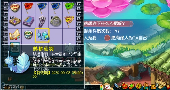 单人任务,到长安的护城河旁边点击“鹊桥仙羽”即可,每日前7次许愿和前77次为他人实现心愿可以获得经验、金钱和物品奖励。该任务为单人任务,参与起来非常简单方便。