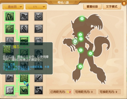在PK方面,盘丝第六行第二个经脉“媚态”,勾魂和摄魄必中,瘴气清除寡欲令。这个经脉任务的时候会点,PK的时候基本上会点“结阵”。