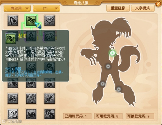 参考天机城的“破击”改动,盘丝第一行第二个经脉“粘附”可能会做调整,譬如点了经脉之后,天罗地网可以封物理攻击。如果杀难度任务可以切换经脉,这样或许会更好。