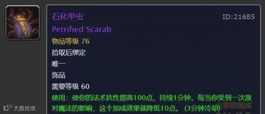 饰品位置上,奥山任务奖励+10冰抗的饰品,同时还有回复生命和2%闪躲,对于DPS来说,最好用的饰品应该是TAQ的石化甲虫了,主动使用提供100点冰抗,持续1分钟。以现在的DPS水平,应该可以覆盖冰龙BOSS战全程了。
