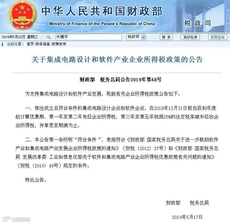 据财政部网站消息,财政部、税务总局近日发布公告,依法成立且符合条件的集成电路设计企业和软件企业,在2018年12月31日前自获利年度起计算优惠期,第一年至第二年免征企业所得税,第三年至第五年按照25%的法定税率减半征收企业所得税,并享受至期满为止。