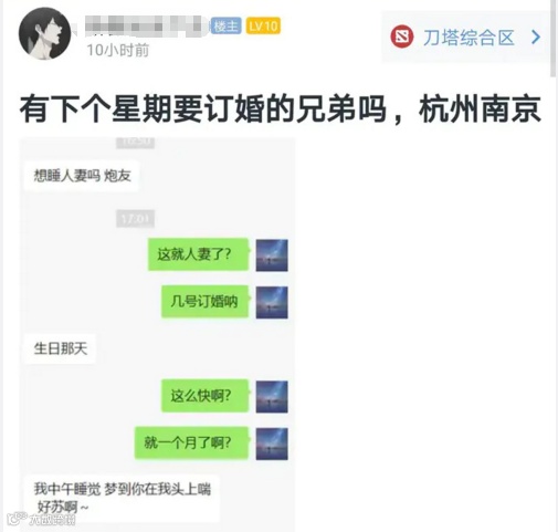 事情的起因十分离奇,在于某DOTA2玩家在社区水贴,表示自己遇上了一位渣女,居然在快订婚的时候还想着约人出轨,并自曝了该渣女的订婚地点为杭州南京一带,时间为一个月内,甚至曝光了自己的微信头像作为证据,仅供DOTA2圈老哥排查。