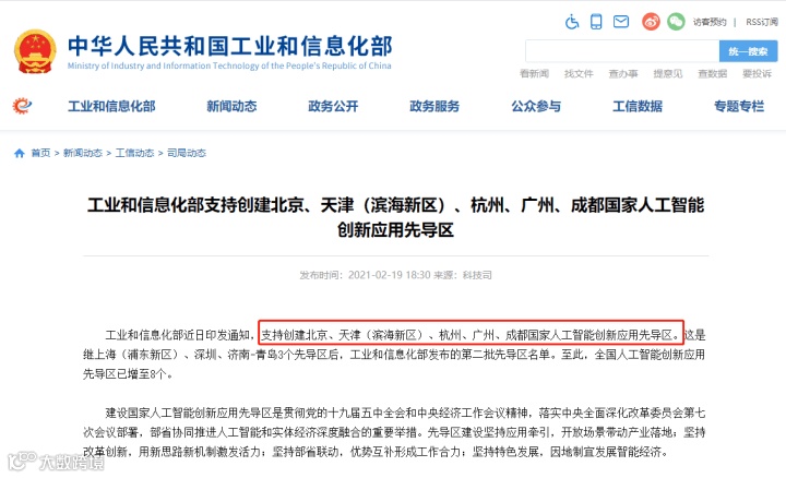 19日晚间,工业和信息化部官网发布公告称,支持创建北京、天津(滨海新区)、杭州、广州、成都国家人工智能创新应用先导区。这是工业和信息化部发布的第二批先导区名单。至此,全国人工智能创新应用先导区已增至8个,成都国家人工智能创新应用先导区为西部首个。