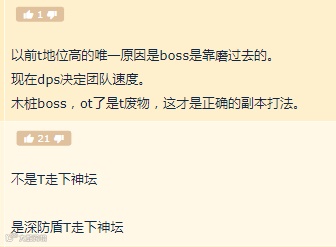 DPS水平的大幅提高,让玩家们看到了更快解决战斗的可能,而实现这个可能,则需要T跟上DPS的步伐,一旦有新型玩法能够实现这个目标,传统玩法自然而然会慢慢被玩家群体所边缘化。因此就这个观点,很多玩家表示,并不是T走下了神坛,而是深防盾T走下了神坛。