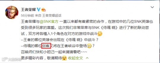 王者荣耀官方微博在今天上午发布了一条消息,宣布将会在后续与SNK《侍魂 晓》进行了新的联动尝试,双方将各植入1个角色在对方的游戏中战斗。