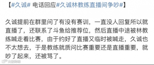 然而接下来林教练却又通知队员需要马上参加赛训,这就让刚直播没一会儿的久诚心生不满。后续双方之间的矛盾甚至升级成了互喷的骂战。