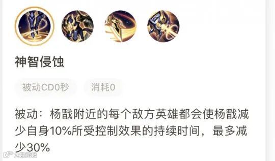 附近每个敌方英雄都会是杨戬减少自身10%所受控制的持续时间,最多减少30%。