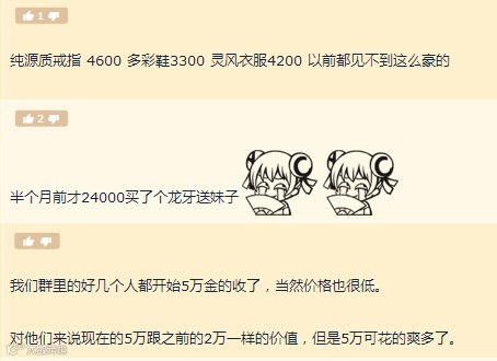 虽然也有网友表示最近去的G团价格还算正常,物价飞涨的感觉还不明显,但现在G价已经跌到了0.08左右,贬值已经成为事实。收G的价格低了,老板们手里的G多了,装备的价格自然就会水涨船高,虽然打工也能因此分到更多的G,但是收益增速与物价增速之间对比,恐怕还是得小伙伴们根据自己服务器的实际情况来判断。