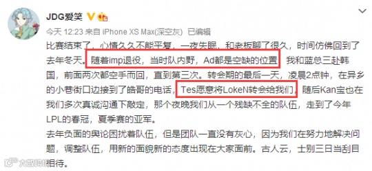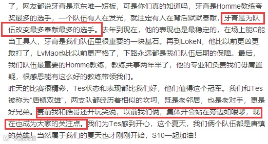 在这段采访之后,许多玩家都开始称赞起JKL的情商之高,能够在获得冠军的时刻,率先感谢拯救自己跳出火坑的战队经理,比很多职业选手成熟太多了。但就在8月28,JDG经理祝贺TES夺冠的长文中,我们却能够看到TES全是皓哥在C的故事。