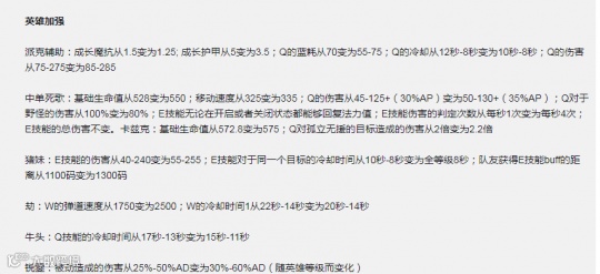 对于部分已经远离英雄联盟赛场上的英雄,设计师还是做出了正向改动的。猪妹、牛头这对动物园组合有可能借此重返赛场,但被秒表克制得死死的劫,恐怕再难有队伍会选用了。