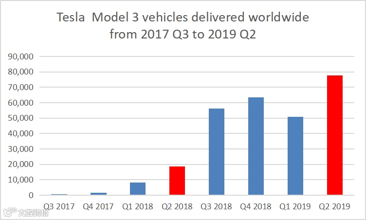 这里的背景是,特斯拉在 Q2 交付了 77550 辆 Model 3,同比增长 320%。