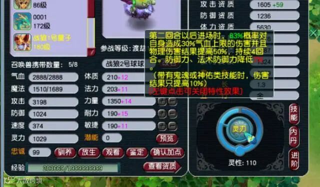 其实混沌球也算个性宝宝,它有多难炼相信只有炼过的人才能深有体会。这只全力进阶110的满灵刃杀人混沌球不仅造型独特,而且资质爆炸,1600攻资加上1.3的成长都是极限,3200点的攻击摄人心神,在配合上灵刃还会提高50%的伤害,这恐怖如斯的一叉子,有谁能受得了?