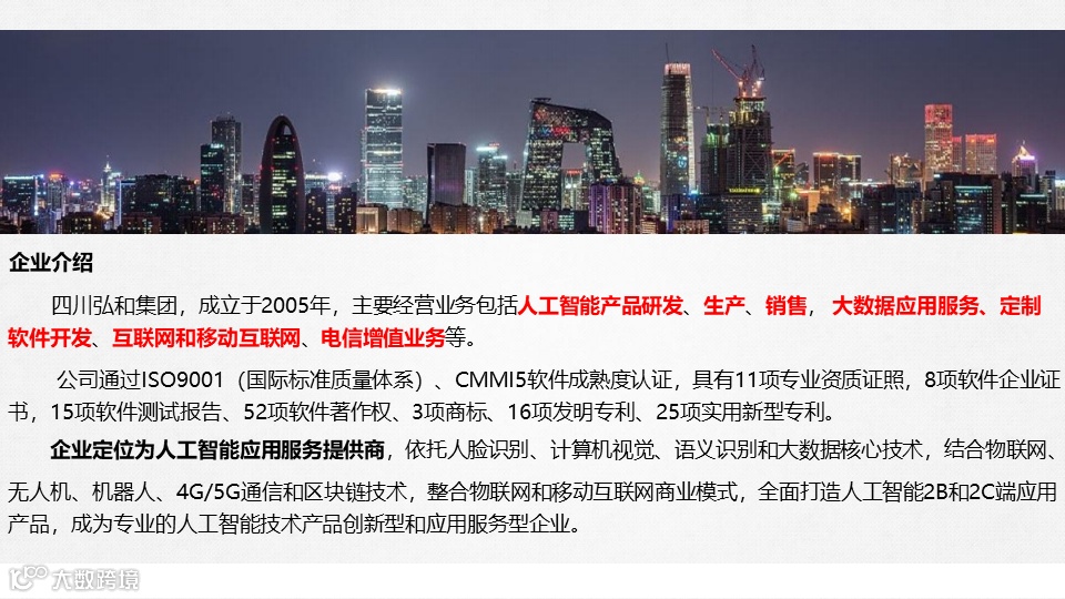 弘和集团具有原创的计算机视觉(CV)技术、一流的研发团队、丰富的商用成功案例、强大的资源整合能力和独特的商业模式等核心优势。同时公司所推出的人脸识别、特定物体识别、行为识别、场景识别、文字识别、预警平台、智慧加油站、医疗追溯等各类AI新技术,已广泛的应用于交通、金融、车站、法院、加油站、智慧零售、工厂、写字楼、园区、医疗等诸多领域,服务上百家知名企事业单位。