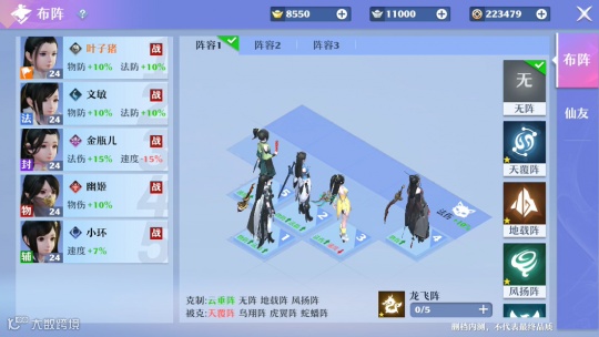 在这种设定上,聪明的玩家一般都会先研究布阵,比如龙飞阵克制云垂阵,天覆阵克制地载阵等,在阵型已定的对局,三回合冷却之后,利用人物和灵宠的位移技能,根据地表因素把仙友挪动,调整部署有利的作战位置,躲避伤害,一样也能反败为胜。