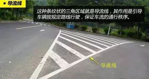 导流线主要为一个或几个根据路口地形设置的白色V形线或斜纹线区域,用于过宽、不规则或行驶条件比较复杂的交叉路口,立体交叉的匝道口或其他特殊地点,表示车辆必须按规定的路线行驶,不得压线或越线行驶,也是禁停区。