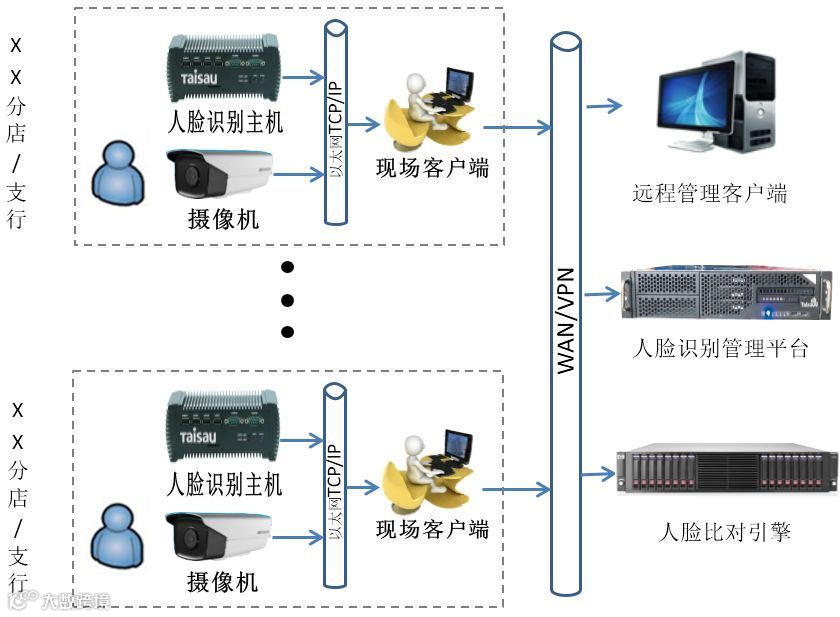 访客人脸比对功能均通过人脸识别主机来完成。由现场客户端统一管理、登记客户数据,并通过网络上传至人脸识别管理平台,从而实现各个分店/支行的VIP客户数据共享、查询。