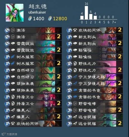 整套卡组只需要1400尘就可以构建,这也是今天大量平民玩家选择用德鲁伊冲分的原因之一。上一次在天梯当中如此强大的德鲁伊,可能还要追溯到巨化德的那个时代了。