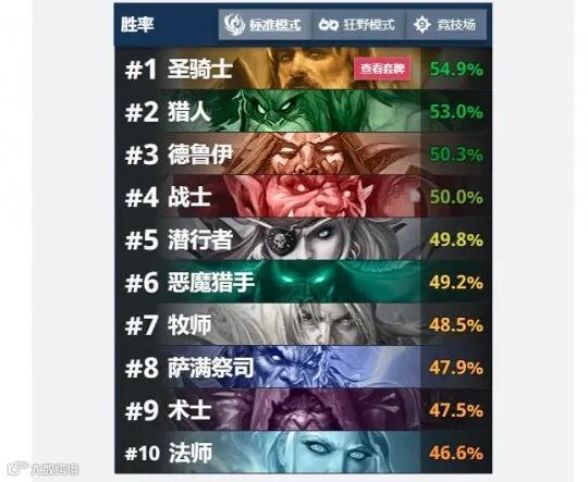接下来就是大家非常关心的天梯胜率变化了。德鲁伊在更新之后成为了最大赢家,更新之前的胜率垫底一跃冲到了胜率榜前列,目前已经冲到了第三名,而且还有继续上升的趋势。恶魔猎手在经历了外域版本的五连砍之后终于跌下神坛,现在胜率已经跌破50%。法师成为了新版本上线第一天,第一个垫底的职业。