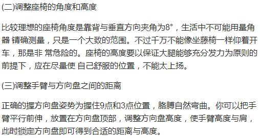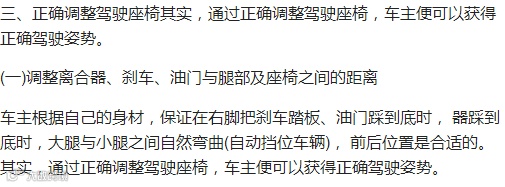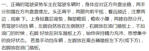 在很多人看来,能把车开走、在路面上安全行驶就算是会开车。不过,在专业人士看来,会开车的人首先要有正确的驾驶姿势,如果连这一点都做不好,最多算是能把车开走,根本算不上是开车的好手。正确的驾驶姿势就是能够方便纵各种装置,并且保持身体处于放松、自然的状态。不正确的姿势会使操纵方 盘和踩踏板困难,影响驾车安全。
