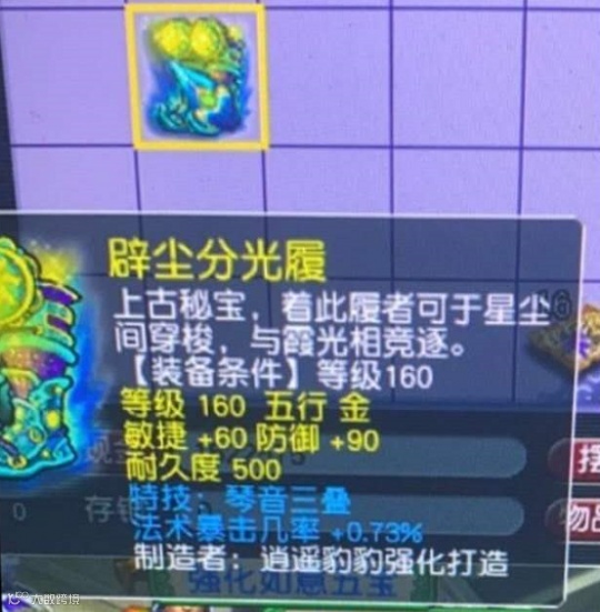 有玩家在网上爆料,有人鉴定出一双琴音三叠160鞋子,60敏捷,90防御,还带0.73%法术暴击几率。琴音三叠跟法术暴击几率刚好匹配,这运气真的给力,要是出个物暴几率就扎心了。