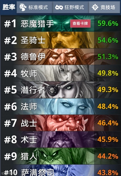 通过数据来看恶魔猎手在竞技场中胜率高达59.6%,标准模式中的胜率达到56.5%,狂野模式的胜率也达到可怕的54.3%,要知道该职业由于是新推出的缘故。因此在狂野模式以及竞技场中缺少了大部分的职业卡,能够达到目前的胜率属实惊人。