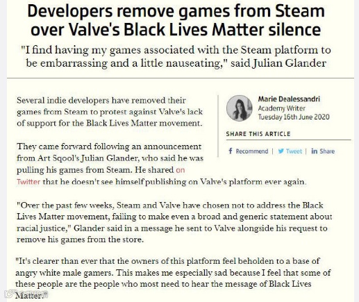 当前动视、EA、索尼、Capcom、育碧、SE等游戏公司都表达了对这一运动的支持,而投了「弃权票」对该事件没有任何回应的V社,却因此引发了新的纠纷。近期就有独立游戏开发者宣称:将会下架自家在Steam上线的游戏,即便自己会每月损失这1000美金。
