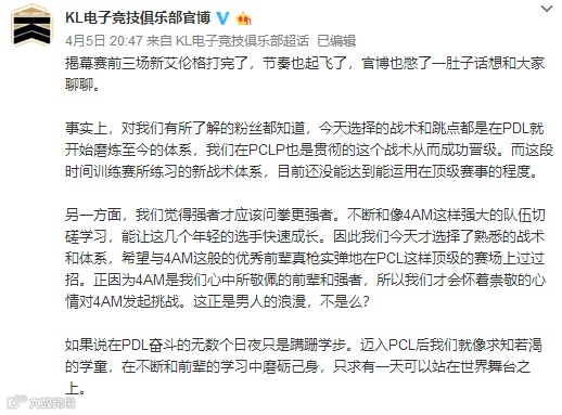 而结合比赛录像来看,很明显目前PCL联赛中Ark、KL、KX这三支战队在配合上,有着不可名状的默契。而被点名要盯防的4AM战队,显然也受到了特殊待遇。而处于风口浪尖上的KL俱乐部也是第一时间发出了公告,表示自己与4AM跳点的重合仅仅是因为想要问拳更强者,这正是男人的浪漫。
