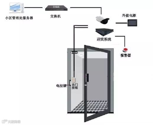 本方案采用的人脸识别系统,是通过核对需要进入人员的面部来进行身份识别的。首先,向每位住户进行人脸信息的登记,并且按照其住宅门洞来划分该住户进出的权限。当住户要进入某个门时,摄像机会自动采集需要进入人员的人脸信息,设备会自动迅速准确的采集人脸信息,然后将读取的人脸信息发送到迎宾主机上,主机通过与该人员事先存储在数据库中的人脸信息进行比对,迅速得出该人脸匹配与否的分析结果,并根据其预设权限确认该人员是否有权限进入该区域。如果匹配,门锁自动开启,否则该人员无法进入。