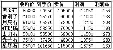 宝石的平均利润率在各个服务器一般在20%左右,根据服务器的不同,利润不同,一般来说有3条规律: