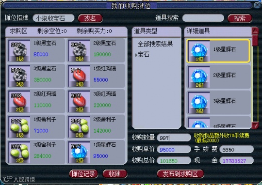 梦幻的宝石(含星辉石)有7种,每种宝石摆摊收购1-3级,星辉石收购1-2级,刚好20个位置,再高等级的宝石一般是通过交易完成收货。摆摊号,根据货品量,可以摆1-6个。