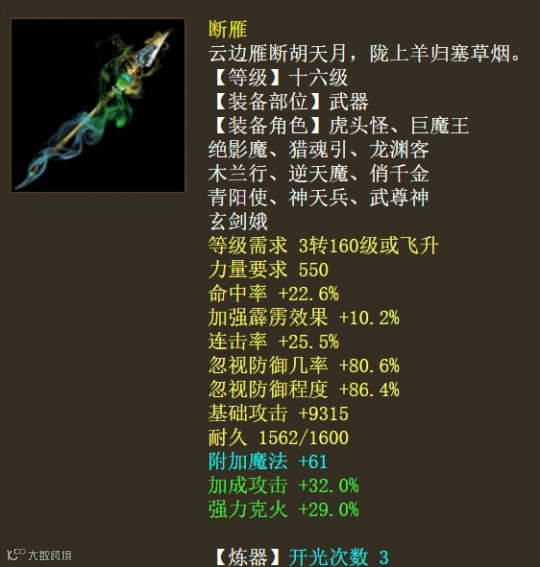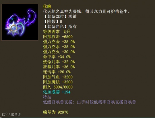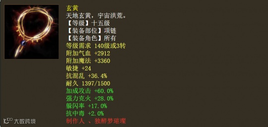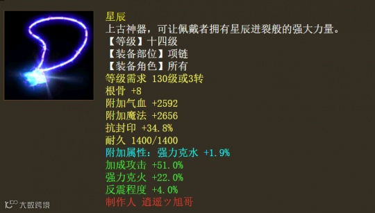 通常武器、项链、星符是占投资比重较大的装备,其余的衣服帽子鞋、配饰等就是起到堆属性的作用,所以尽量将重点放在前三件装备上。例如武器,选择一把双破过80、强龙法带命中、炼化加成带克的算是较为标准的配备:
