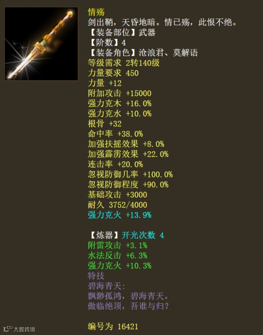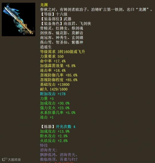 需要注意的是,武器的基础攻击这一属性尽量要选择高一些的,至于炼器方面可以后续自己慢慢尝试,好的炼化和炼器对武器的价格影响非常大,例如上面这把武器在游戏中200元以内就可以买到,但如果炼器和炼化更出色的话,价值或许能翻10倍都不止,例如下面这把: