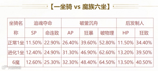 先来看一坐骑和魔族六座的对比,就从最基本的敏、攻、血这三条属性来看,正常一坐管制后和魔族6坐的速度差了1.10%,攻击差了5.90%,血量差了2.0%,而在进化之后,差距缩小分别为0.20%、1.0%和0.30%;